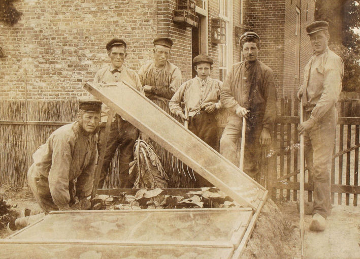 Foto van rond 1910, op de tuin. Een van de oudste foto's in ons bezit van "plat glas", de zogenaamde eenruiters (zie Hendrick Jacobusz. Eijgenraam). Van links naar rechts: 3e: Cornelis Eijgenraam, geb. 20-8-1850, 4e: Leendert Arie (Leen) Eijgenraam, geb. 21-9-1895, 5e: Abraham Alexander (Abram) Eijgenraam, geb. 11-2-1887, 6e: Johannes Abraham, geb. 1-3-1884, 4, 5 en 6 zijn zonen van Cornelis. En afstammelingen van Hendrick Jacobusz. Eijgenraam, vanaf hem ging het tuindersvak van vader op zoon. |