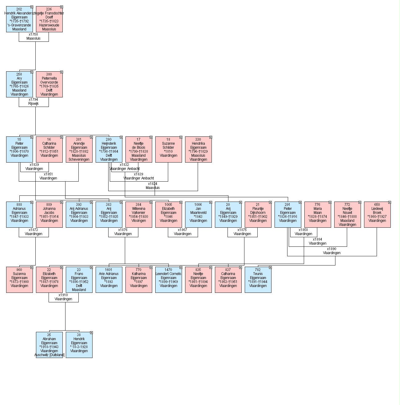 Elizabeth Eijgenraam, geb. op 27 jun 1846 te Vlaardingen, tr. op 6 nov 1867 te Vlaardingen met Jan Maarleveld , zn. van Arij Maarleveld en Neeltje van der Brugge, geb. in 1843 te Vlaardingen.