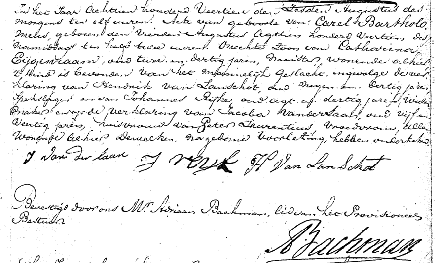 ‘t Kind is bevonden van het mannelijk geslacht, ingevolge de verklaring van Hendrik van Lanschot, oud 39 jaren, spekslager en van Johannes deRijke, oud 38 jaren, wielenmaker en (onduidelijk: volgens ) de verklaring van Jacoba van der Laan, oud 45 jarem, huisvrouw van Petrus Laurentius, vroedvrouw, allen wonende alhier. De welken, na gedane voorlezing hebben ondertekend: J. van der Laan, J. (onduidelijk Reijk), H. van Lanschot. Bevestigd door ons Mr. Adriaan Bachman, lid van het Provisioneel (Provinciaal?). Bestuur