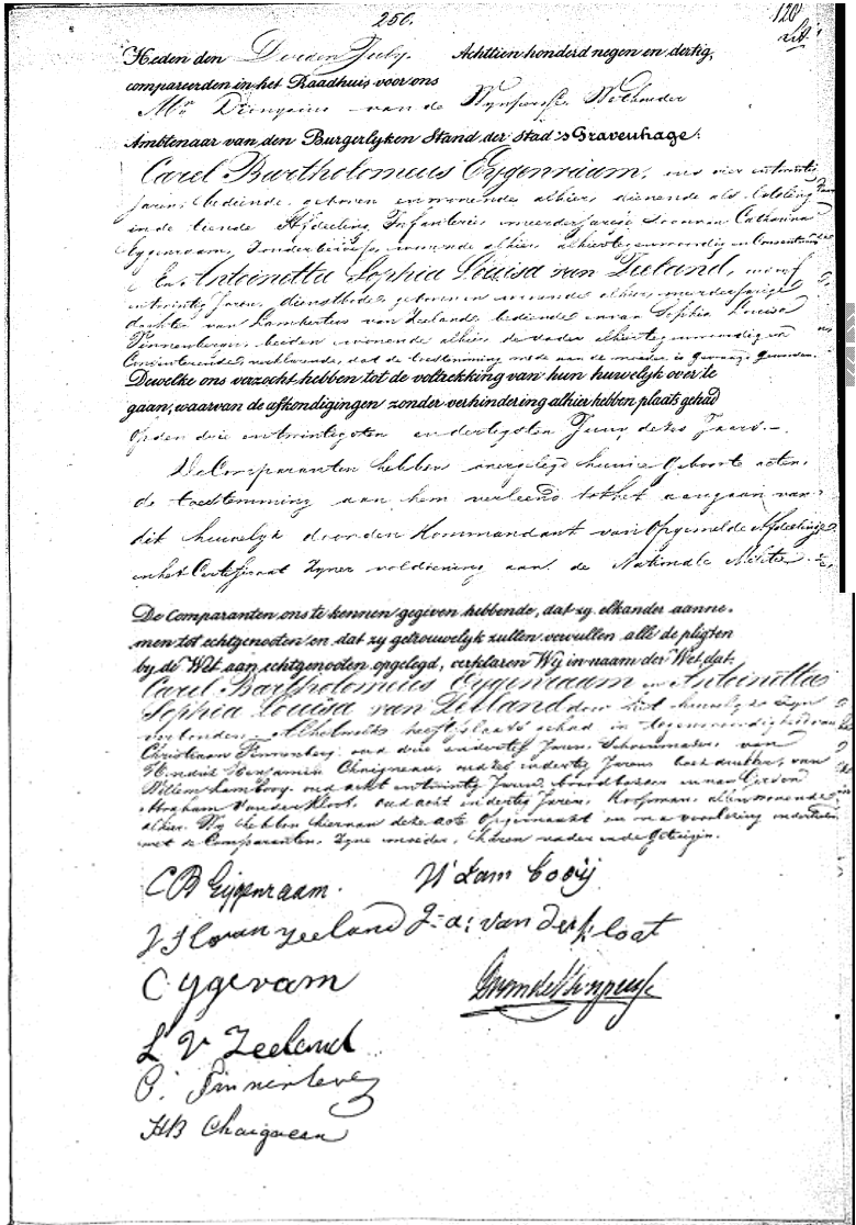 Bij de huwelijksvoltrekking van Carel Bartholomeus en Antoinetta Sophia van Zeeland in 1839 is Catharina Eijgenraam “persoonlijk aanwezig”, dit wordt vermeld in de tekst van de huwelijksakte nl; wonende alhier, alhier tegenwoordig en consenterende. Ook ondertekend Catharina als : C.IJgevam.