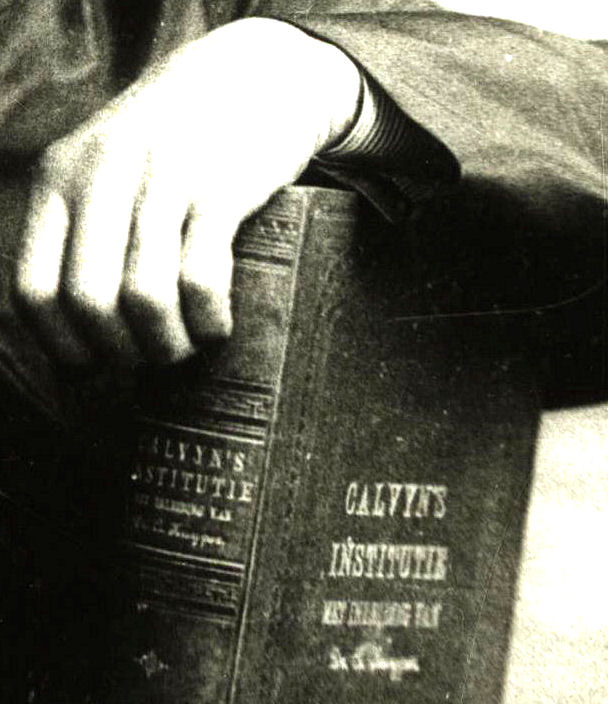 Van hem lezen we in zijn door de familie bewaarde memoires, hoe hij onvrede had met de prediking van de hervormde dominee van 't Woudt. Zijn arm rust hier op de "Institutie" van Calvijn.