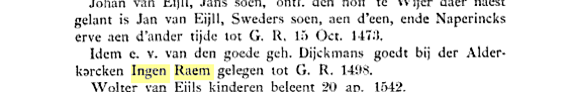 Dijckmans goedt bij der Alder- karcken Ingen Raem gelegen tot GR 1498. Wolter van Eijls kinderen beleent 20 ap. 1542. Haer hulder is Cornelis van Bodbergen, ende Sophia van Bo- nenburgh van Honsten, weduwe Wolters behelt tucht.
