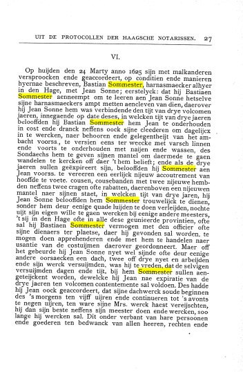 Op huijden den xxiiii Octobris A[nno] 1655 compareerden voor mij Corn[elis] van Delvendiep, notaris publicq bij den Hove van Hollant, geadmitteert, in s�Gravenhage residerende, ende den getugen onder genomineert d�heer Abraham van Asperen, als speciale procuratie hebbende vande heeren Pieter Marselius en[de] Tieleman Lusakena Beijde wonende in Moscovien. Sijnde voorn[oemde] procuratie gepasseert onder de handt van[de] voorn[oemde] heeren. In date de[n] xxvii julij 1655. Ons notaris en[de] getugen originelicken verthoont ende voorgelesen ter eenre, ende d�eersame Pieter Pouwels[sen] Ingeraem m[eester] harnasmaecker, wonende alhier in S�gravenhage, voors[eit] ter andere sijde, verclaerende sij comparanten met malcanderen geaccordeert en[de] aengegaen te hebben seecker contract als volcht: te weten dat hij Pieter Pouwels[sen] Ingeraem met de gemelte Heeren ofte desselfs volmachtigde in dienste sal vertrecken naer Moscovien omme den tijdt van vier achtereenvolgende jaren bij welcken hij hem mitsdesen aen[de] voorn[oemde] heeren Pieter Marselius en[de] Tieleman Lusakena vast verbindt en[de] van[de] selven oock aenge- nomen wert op des aennemers iserwercken te Povodijsen in Ruslant te arbeijden en[de] carubine, wapenen voor en[de] achter met een poth en[de] voorschoot vrij, en[de] achter light te maecken�� ingaende den voors[egde] termijn van vier jaren, so datelick als hij Pieter Pouwels[sen] Ingeraem op de voors[egde] iserwercken sal sijn gearriveert, alwaer oock mede sijn vrou en[de] kinderen. Wanneer sij sullen werden van[de] voorn[noemde] Ingeraem aldaer ontboden t�haren heeren aennemers costen gevoert en[de] gebracht werden. Alles vrij so vrij van montcost als reijscosten en[de] sonder dat ijets diesweghen op desselfs naergenoempt arbeijtsloon sal mogen gecort werden. Des sal hij Pieter Pauwels[sen] Ingeraem sijn voors[eide] handt- werck trouwelijck exerceren moeten en[de] de voors[eide] wapenen heel goet moeten maecken en[de] lever- baer op de proeff neffens andere goede meesters. Ende voor hij ijder harnas met de poth gemeten voor arbeijtsloon tweendartich stuvers hollants gelt ofte de waerde van dien en[de] dat vrij