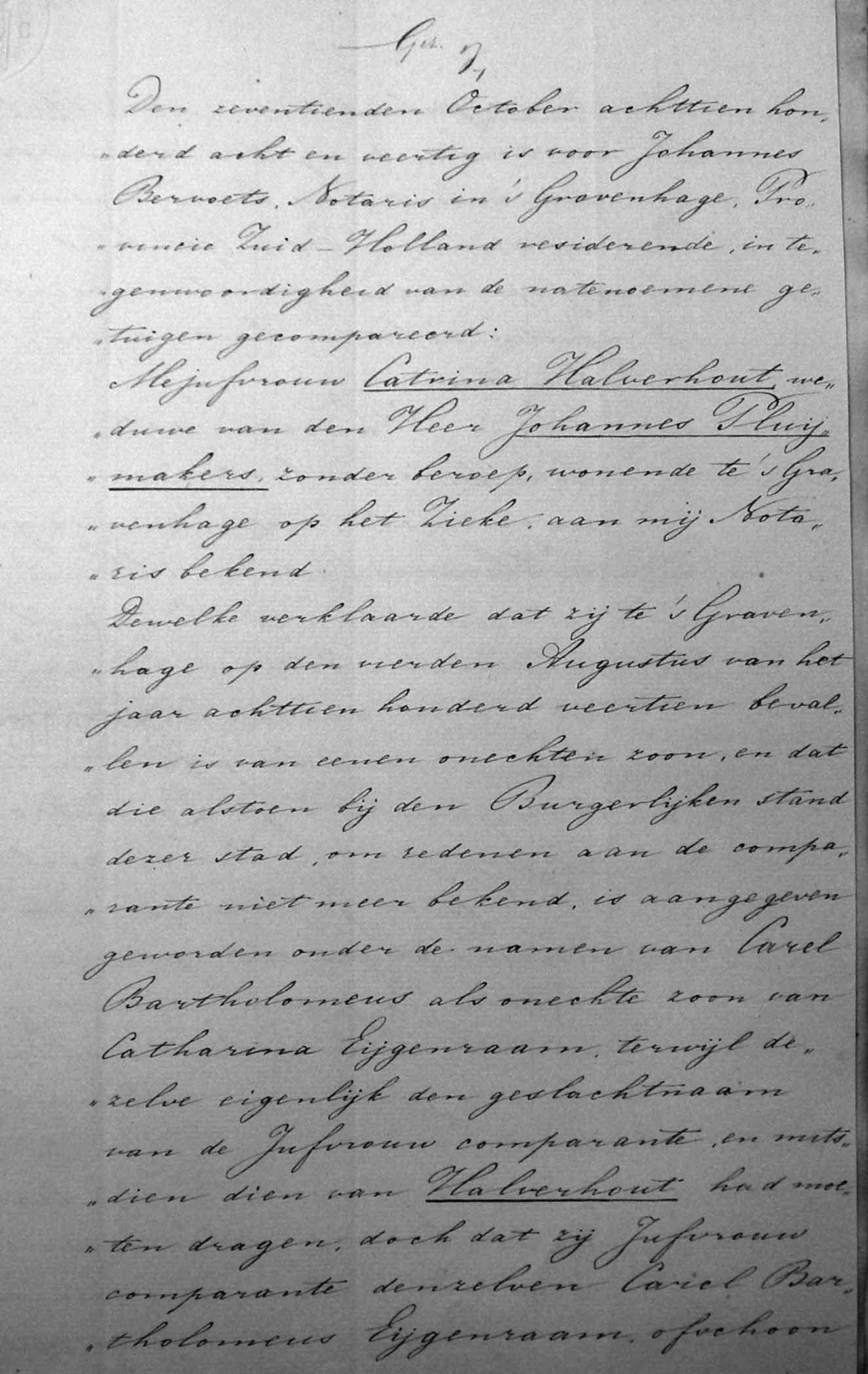 Mejufvrouw Catrina Halverhout, weduwe van den Heer Johannes Pluij-makers, zonder beroep, wonende te 's Gravenhage op het Zieke, aan mij Notaris bekend. Dewelke verklaarde dat zij te 's Gravenhage op den vierden Augustus van het jaar achttien honderd veertien bevallen is van eenen onechten zoon, en dat die alstoen bij den Burgelijken stand dezer stad, om redenen aan de comparante niet meer bekend, is aangegeven geworden onder de namen van Carel Bartholomeus als onechte zoon van Catharina Eijgenraam, terwijl dezelve eigenlijk den geslachtsnaam van de Jufvrouw comparante, en mitsdien dien van Halverhout had moeten dragen, doch dat zij Jufvrouw comparante denzelven Carel Bartholomeus Eijgenraam, ofschoon
