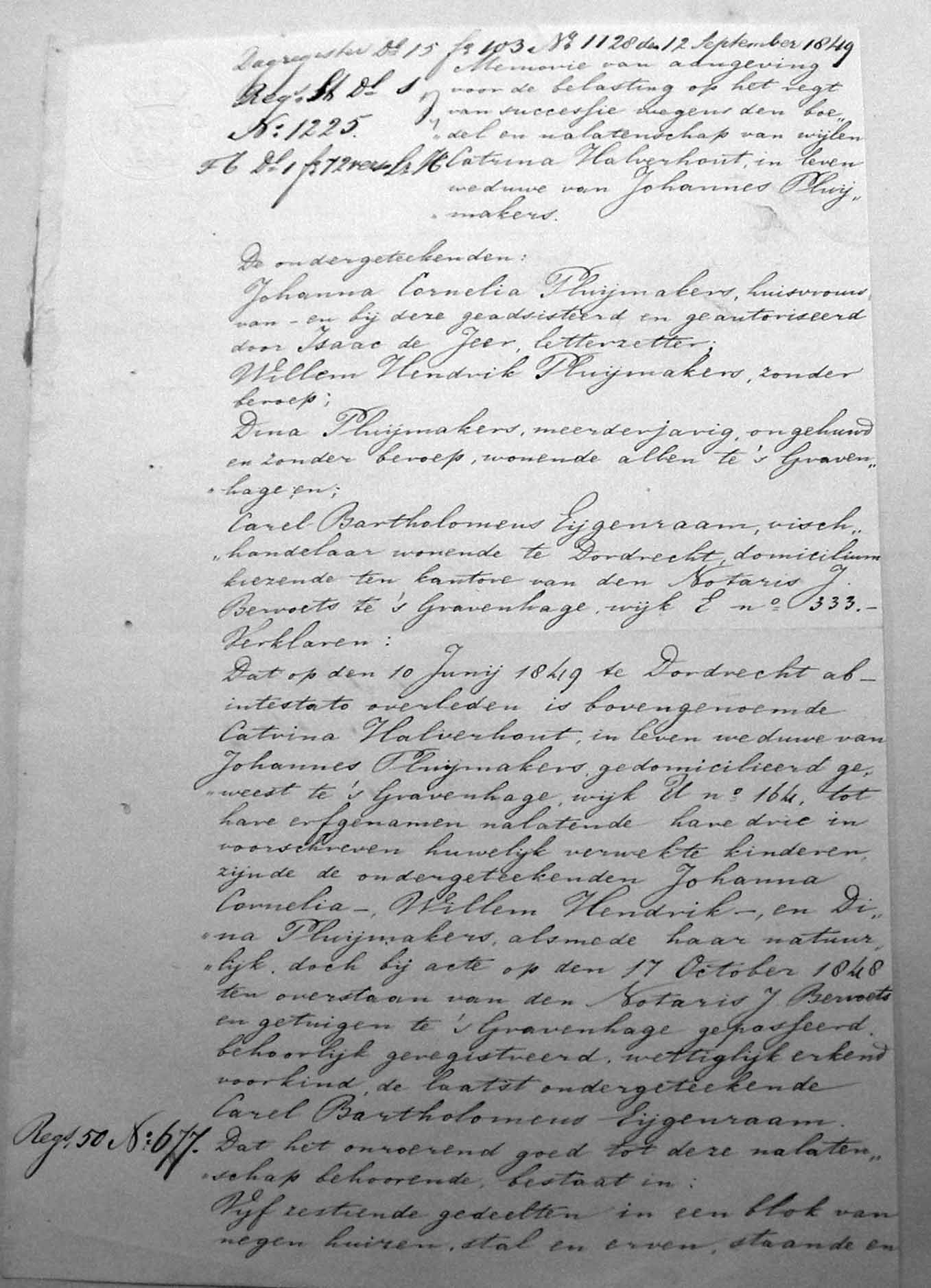 De ondergeteekenden: Johanna Cornelia Pluijmakers, huisvrouw van - en bij deze geadsisteerd en geautoriseerd door Isaac de Jeer, letterzetter; Willem Hendrik Pluijmakers, zonder beroep ; Dina Pluijmakers, meerderjarig, ongehuwd en zonder beroep, wonende allen te 's Gravenhage ;en; Carel Bartholomeus Eijgenraam, vischhandelaar wonende te Dordrecht, domicilium kiezende ten kantore van den Notaris J. Bervoets te 's Gravenhage, wijk E no 333. Verklaren: Dat op den 10 Jumij 1849 te Dordrecht ab intestato [(erfgenaam) bij gebrek aan testament] overleden is bovengenoemde Catrina Halverhout, in leven weduwe van Johannes Pluijmakers, gedomicilieerd geweest te 's Gravenhage, wijk U no 164, tot hare erfgenamen nalatende hare drie in voorschreven huwelijk verwekte kinderen zijnde de ondergetekenden Johanna Cornelia -, Willem Hendrik -, en Dina Pluijmakers, alsmede haar natuurlijk, doch bij acte op den 17 October 1848 te overstaan van den Notaris J.Bervoets en getuigen te 's Gravenhage gepasseerd, behoorlijk geregistreerd, wettiglijk erkend voorkind, de laatst ondergeteekende [in de marge: Regs 50 No 677.] Carel Bartholomeus Eijgenraam. Dat het onroerend goed tot deze nalatenschap behoorende, bestaat in: Vijf zestiende [5/16] gedeelten in een blok van negen huizen, stal en erven, staande en