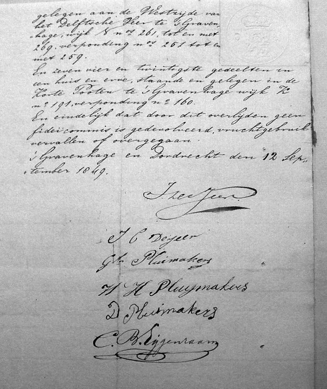 gelegen aan de Westzijde van het Delftsche Veer te 's Gravenhage, wijk N nos 251, tot en met 259. En zeven vier en twintigste [7/24] gedeelten in een huis en erve, staande en gelegen in de Korte Pooten te 's Gravenhage wijk Kno 191, verponding no 160. En eindelijk dat door dit overlijden geen fide� commis [fideicommissum: testamentaire beschikking, waarbij men een vertrouwd persoon die voor de wet als erfgenaam optreedt, opdraagt een zeker legaat uit te keren aan iemand die wettelijk niet als erfgenaam kan worden aangewezen; de erfgenaam heeft vruchtgebruik, d.w.z. hij mag de vruchten, inkomsten behouden, maar moet het eigendom in stand houden en zo nodig aan de eigenaar teruggeven] is gedevolveerd [afgekomen, afgewenteld, afgerold], vruchtgebruik vervallen of overgegaan. 's Gravenhage en Dordrecht den 12 September 1849.
